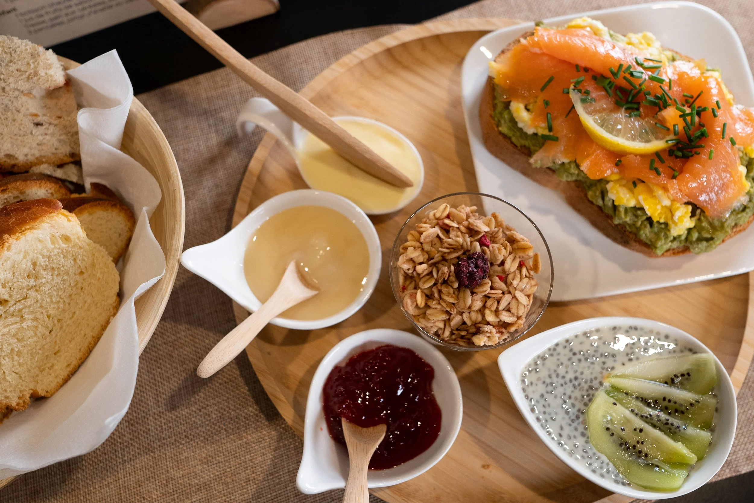 Pour une option plus complète, la formule Salé Sucré ajoute des toasts avocat, saumon et œuf, ainsi que du yaourt granola et crème de chia aux fruits frais.