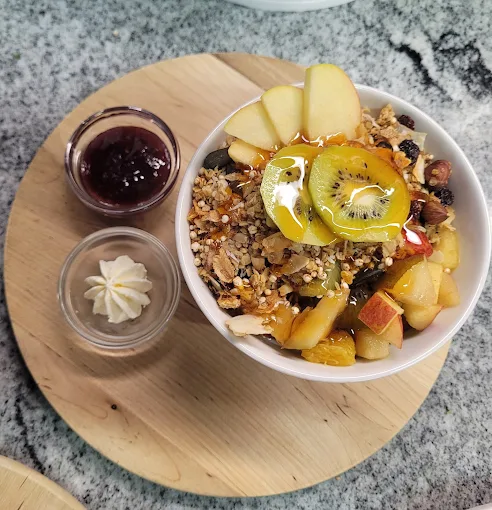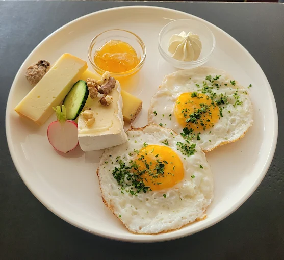 Plutôt que sous la forme d’un buffet, il s’agit d’un brunch à la carte, où l’on choisit directement ce qui vous fait envie. Le menu propose une large palette de préparations salées et sucrées : des variations de muesli avec fruits et yaourt, des œufs sous différentes formes, des options avec pain, confitures et beurre, ainsi que des combinaisons plus consistantes avec fromage, bacon ou même des versions végétariennes et véganes.